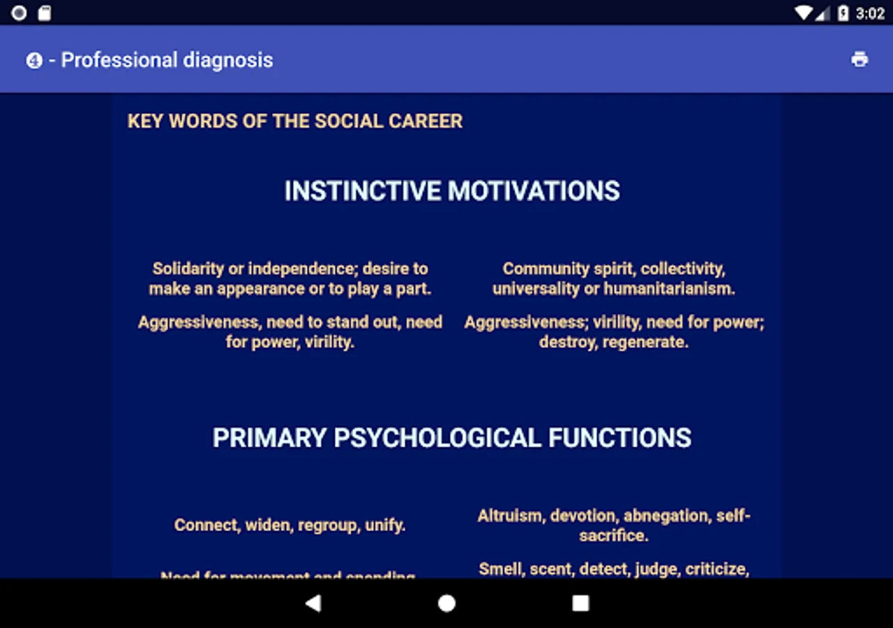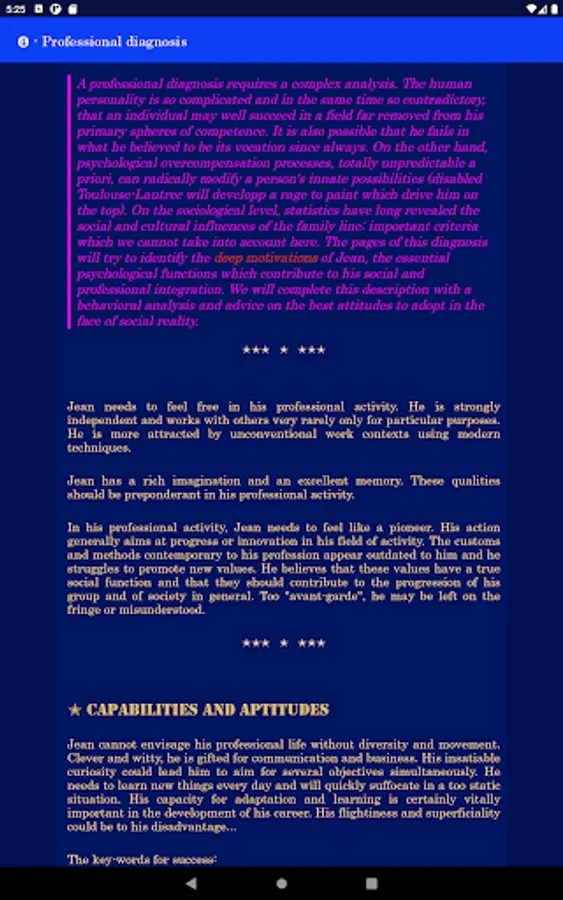 The psychological study uncovers the basic structure of the native's personality. The following facets are discussed: self-ideal, affectivity and sexuality, mental abilities and dynamic resources.