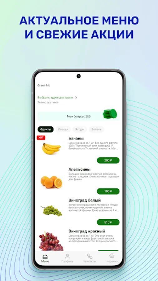 Green hit is a new convenient way to order your favorite fruits and vegetables without leaving your home. Ordering fruit at home has never been easier! In the application, you have access to a quick and convenient order, an always up-to-date and colorful menu, mouth-watering photos, promotions and latest news, feedback and our contacts!