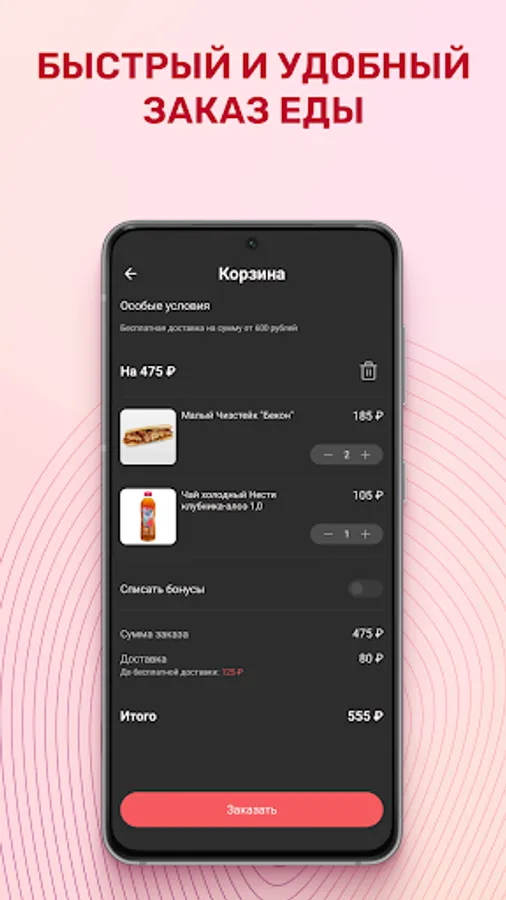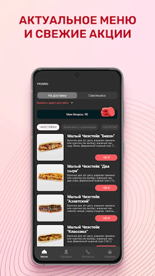 The VKUSNO mobile application is a quick and convenient way to order rolls, pizza, burgers, hot dogs, shawarma and barbecue, as well as desserts, ice cream, cheesecakes, pancakes from our cafe. In our VKUSNO application, you can order food with benefit from the bonus program, the current menu, interesting promotions and latest news, our contacts and much more!