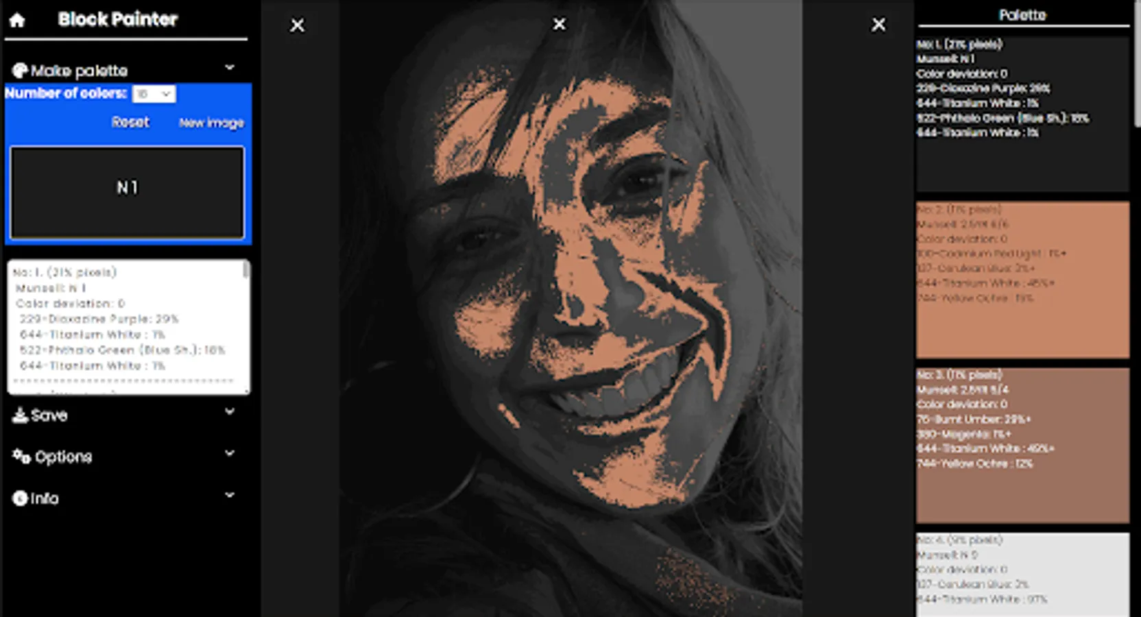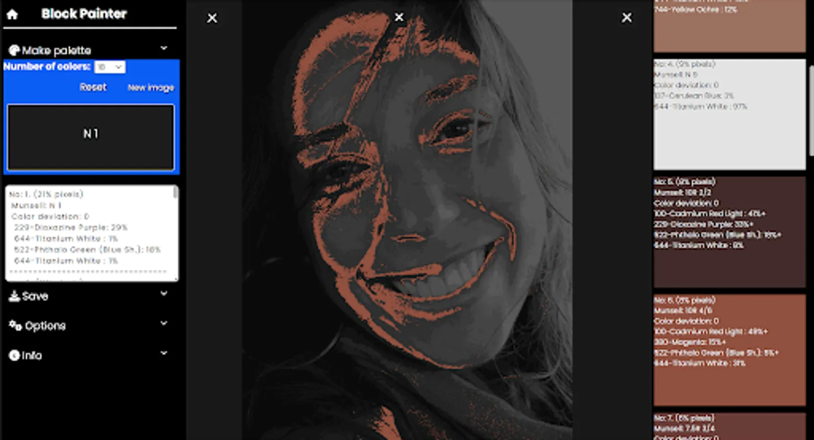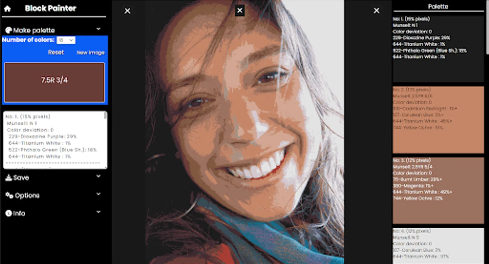 Block Oil Painter will tell you which color to use, how to mix them and where to use them in the image. You can choose between Artisan from Winsor & Newton, Georgian water mixable oil from Daler-Rowney, Grumbacher Max from Grumbacher, or Cobra from Talens. The mixed color is made from a palette with either 16 different tubes from Artisan, 11 tubes from Georgian, 18 tubes from Grumbacher, or 12 tubes from Cobra. The imported image will be shown with “standard Munsell colors”.