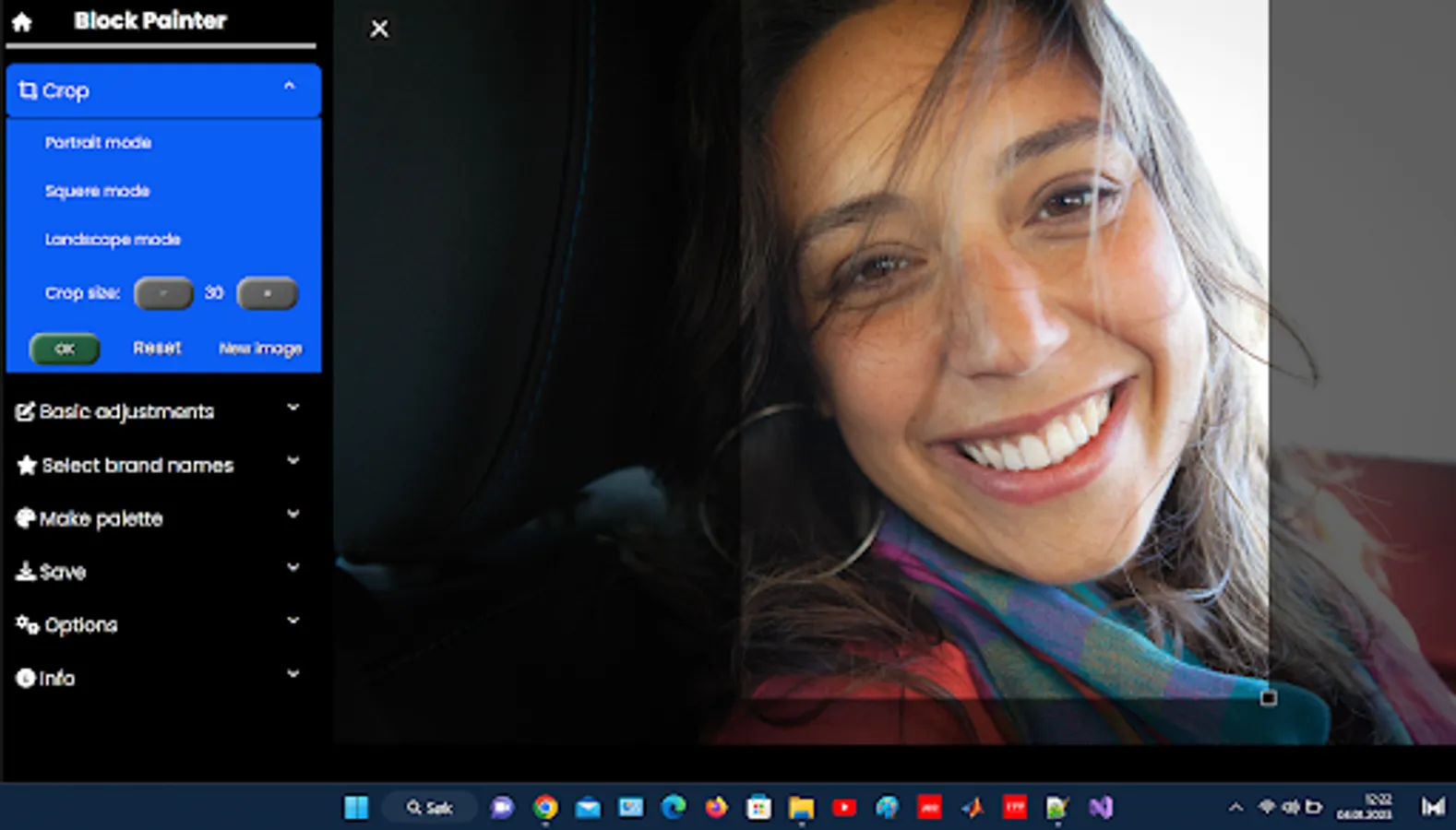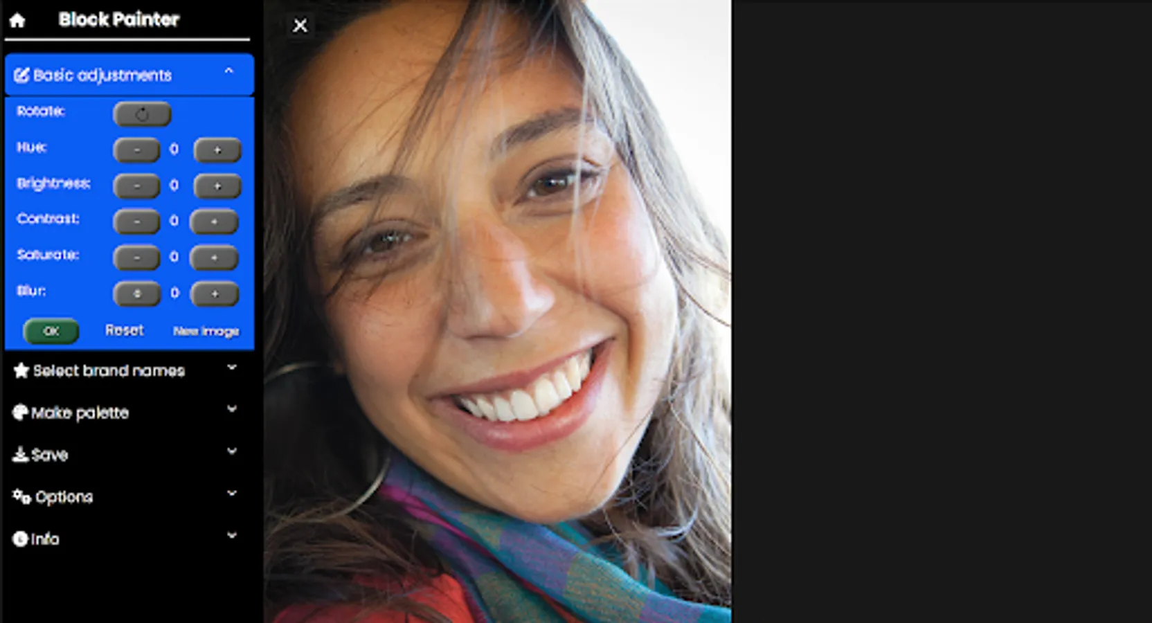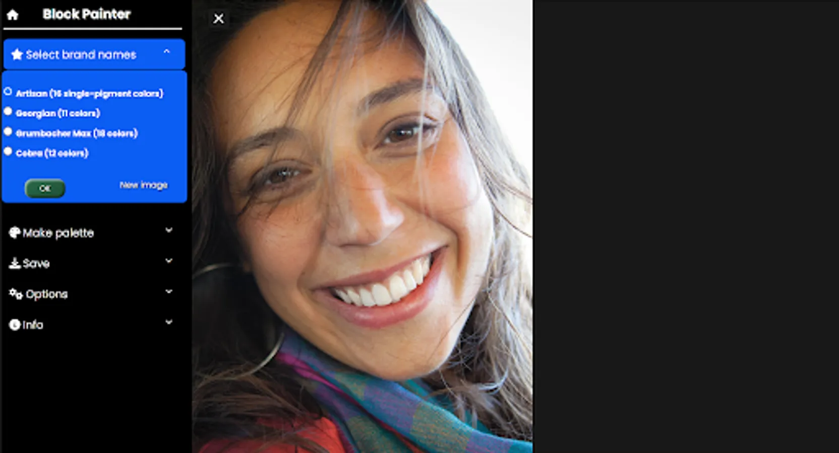 Block Oil Painter will tell you which color to use, how to mix them and where to use them in the image. You can choose between Artisan from Winsor & Newton, Georgian water mixable oil from Daler-Rowney, Grumbacher Max from Grumbacher, or Cobra from Talens. The mixed color is made from a palette with either 16 different tubes from Artisan, 11 tubes from Georgian, 18 tubes from Grumbacher, or 12 tubes from Cobra. The imported image will be shown with “standard Munsell colors”.