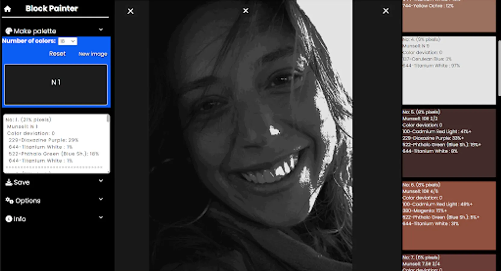 Block Oil Painter is a tool for water mixable oil painters using a photograph as a starting point. It is based on the Munsell color system.