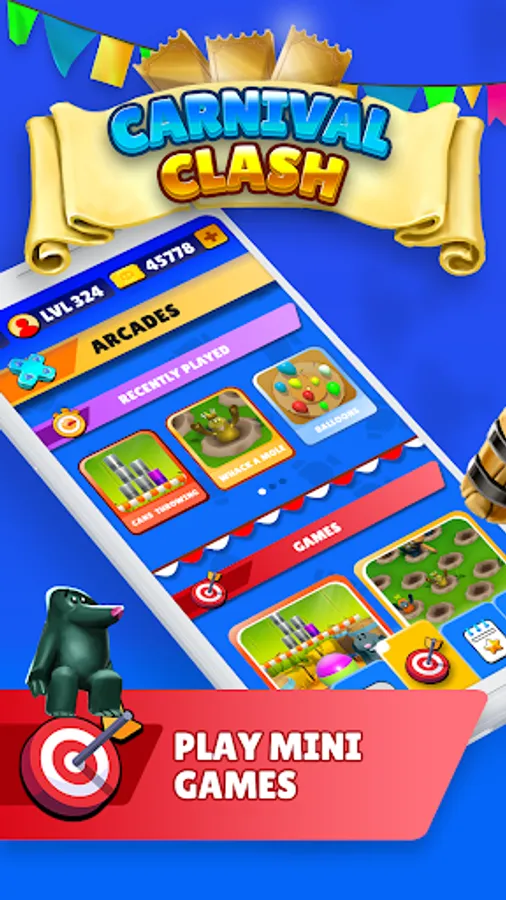 Carnival Clash is a fair in your pocket! Play exciting mini-games and get instantly transported to a colorful world of carnival fun. Get ready for a wild ride with vibrant visuals, catchy tunes, and loads of fun-packed challenges, all on your phone! Whack moles, throw daggers or cans, or climb trees like a pro – you’ll never get bored! More games are coming soon!