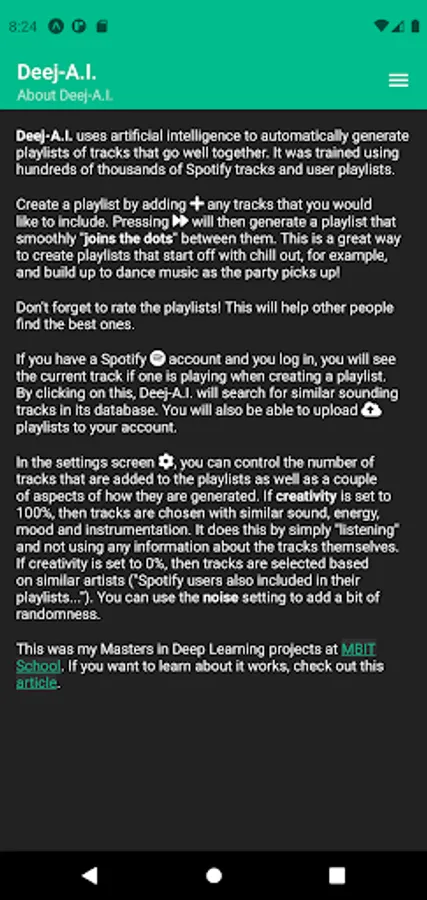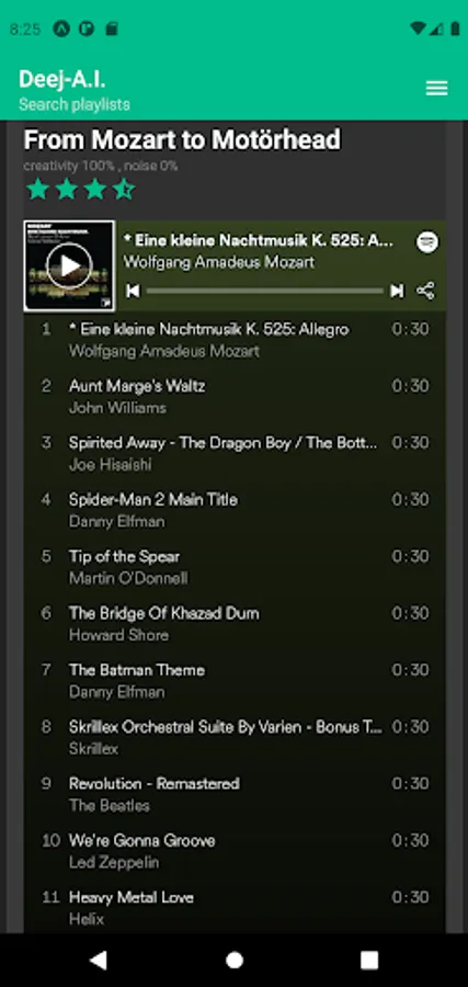 Discover new music using Artificial Intelligence to automatically generate playlists based on how the music sounds. Create your own musical journey that smoothly "joins the dots" between the songs that you choose (for example, from Mozart to Motörhead). Try playing around with the creativity parameter.