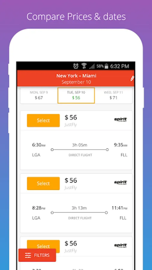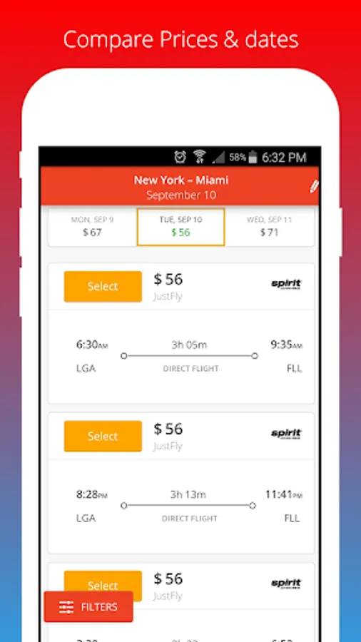 ✓ Filter results by price, departure airport, airline, number of stops, take-off and landing time