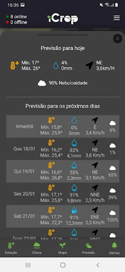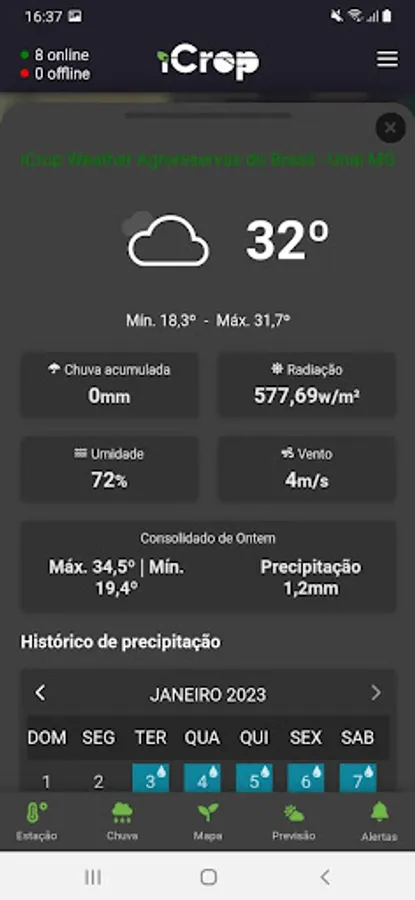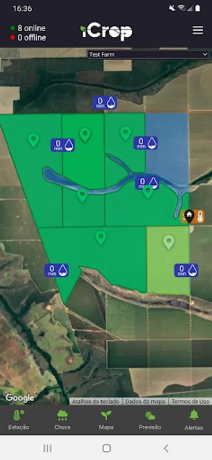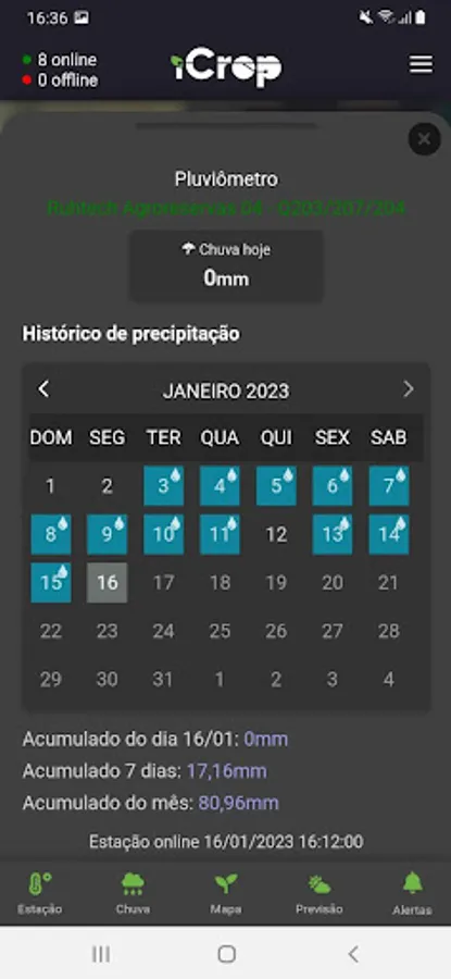 The iCrop Performance app is an optimized version of the pilot.icrop.online webapp. Through it, our customers who have non-irrigated areas can monitor the active areas, have access to data from the pluviographs in real time and access to data from the station and weather forecast and management of the fields.