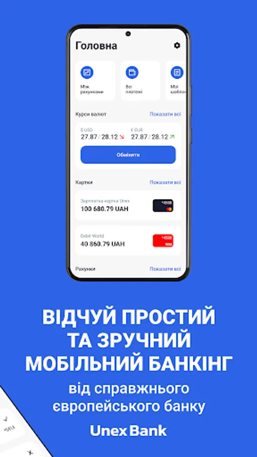 Home - all the most important services are collected here: quick access to popular payments, exchange rates, all your products, recent operations, quick search for branches and ATMs, as well as news. You can customize the section yourself: leave the most important or change order of widgets.