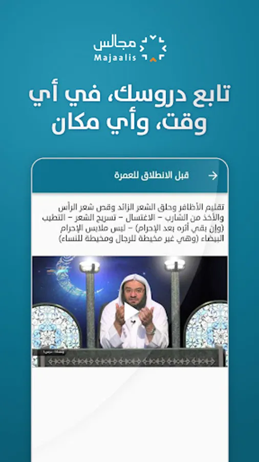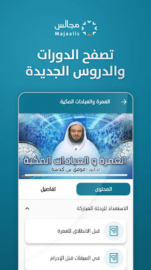 The “Majalis” application was designed to facilitate Sharia studies for students of knowledge. Through it, you can follow all the lessons and scientific courses on the platform in which you study through the phone. Even in cases of internet interruption, you can watch the lessons and return to them easily and easily.