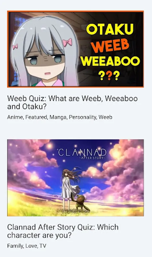 Anime quizzes for Weebs and Otakus Take an anime quiz now! The ultimate anime and manga quiz app! Whether you like to duke it out against time in survival mode or prefer to chill with brain teasers and entertaining quizzes, the WeebQuiz app with its fantastic Anime Quizzes is made for you as it will take you on a thrilling journey through exciting anime questions! So, take our ultimate anime quizzes now and challenge your anime and manga knowledge!