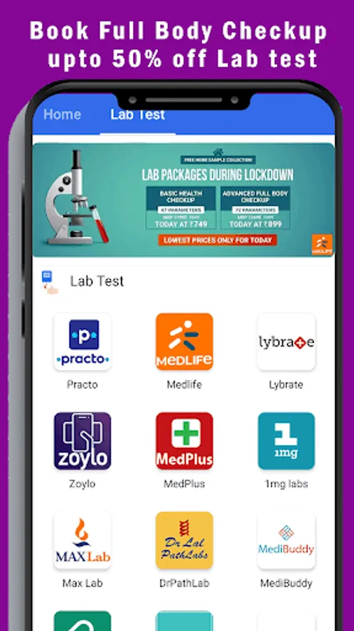 Practo, Medlife lab test, Lybrate, Zoylo Lab test, Medplus, 1mg, Medibuddy, Pharmeasy, Portea, SastaSunder diagnostic etc