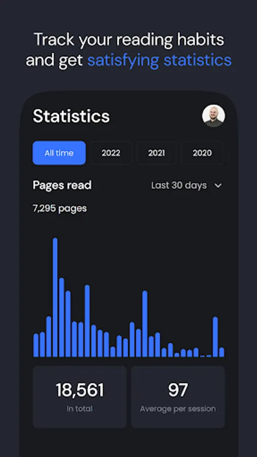 Adding your books is as simple as a Google search. Find the titles you want and add them directly to your library. Track your reading habits and get satisfying statistics. See how many pages you’ve read over the last 7, 14, or 30 days, your average book length and what your most popular genres are.
