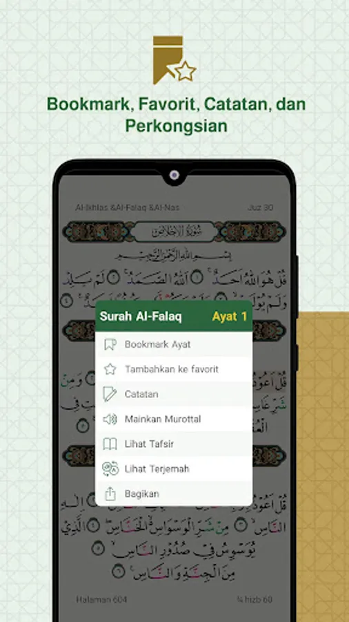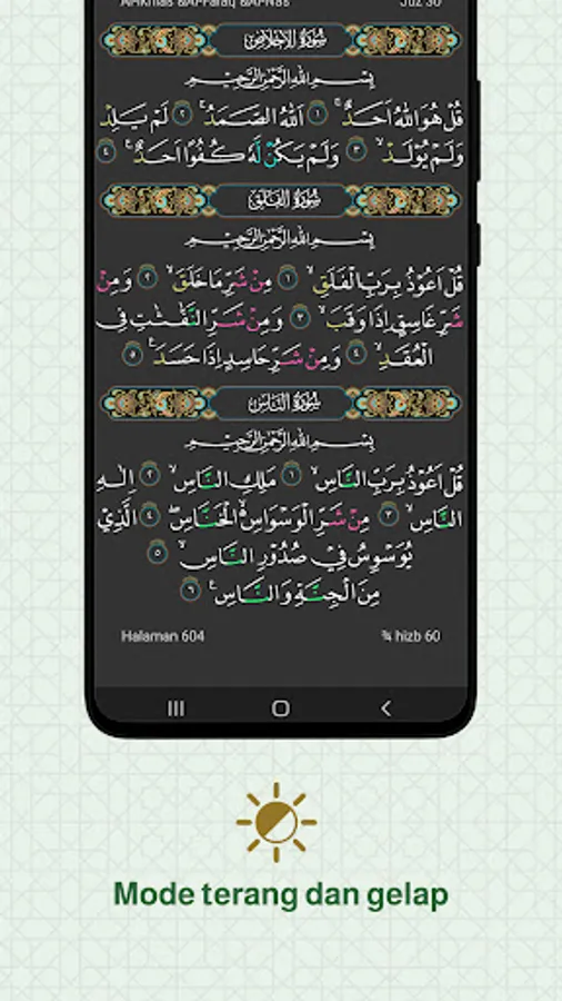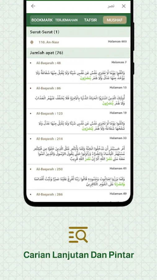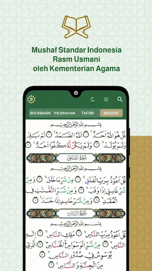The Qur'anic verses in this application use the Indonesian Rasm Usmani Standard Mushaf by the Ministry of Religion c.q. Lajnah Pentashihan Mushaf Al-Qur'an. In addition to presenting the complete 30 juz of the Qur'anic text and pages of the Qur'an from three editions of the Qur'an (Kemenag, and the Madina version), this application is also equipped with several translations, and interpretations of the Quran.