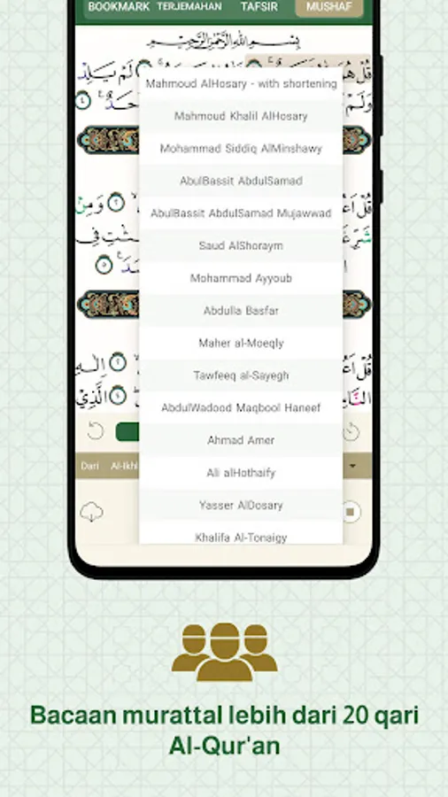 Listening to the recitation of the Quran by famous reciters, while highlighting the verse being recited.