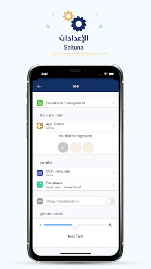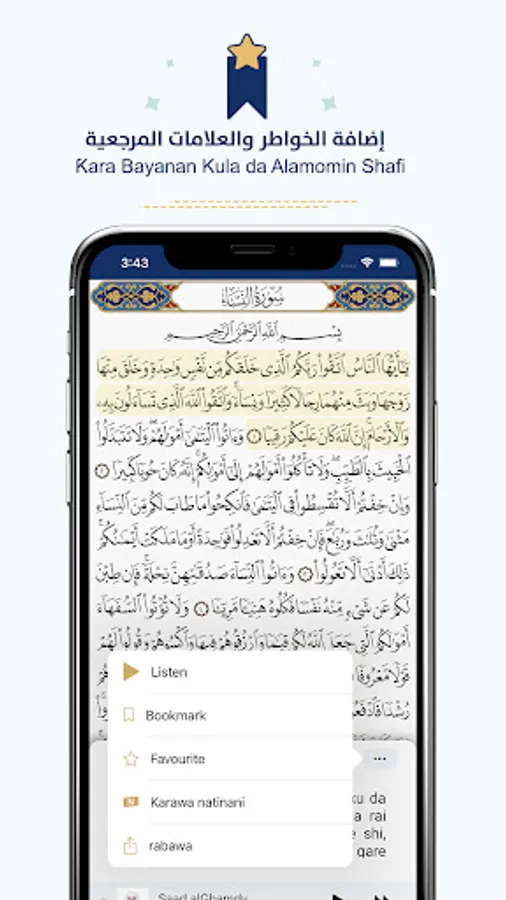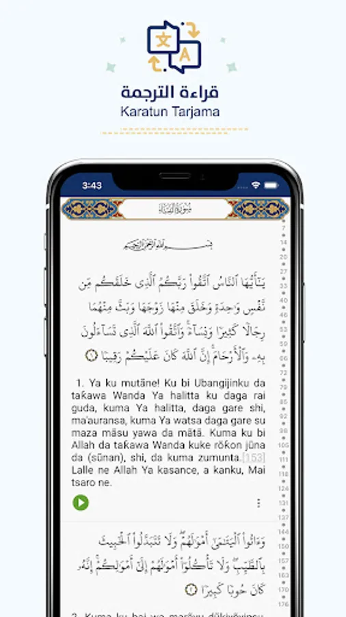 - Tarjama ta Sauti: Sauraron Tarjama ta Sauti na Ma'anonin Alƙur'ani Mai Girma da Yaren (sunan yaren a nan)
