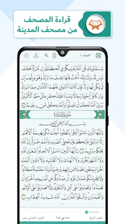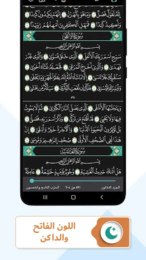 6. Easy navigation to specific Surah or part, through an index menu at the top, or a slider bar at the bottom of the app, or by simply searching the page number in the search bar.