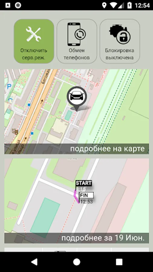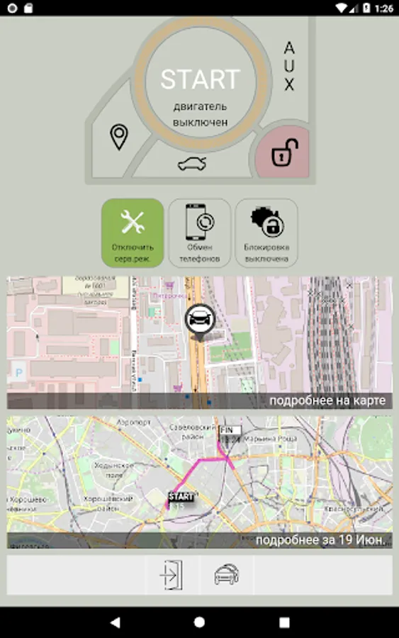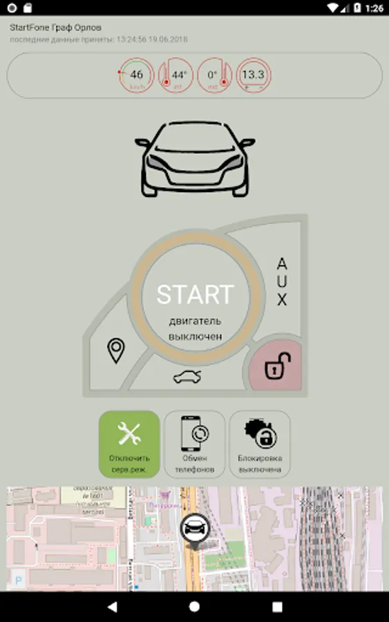 Driving with a mobile phone or tablet. Starting the car to warm up, viewing locations car traversed tracks, engine lock management service mode, the coordinates of a request, setting and disarming.