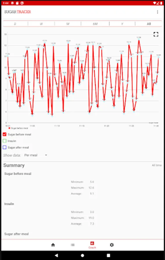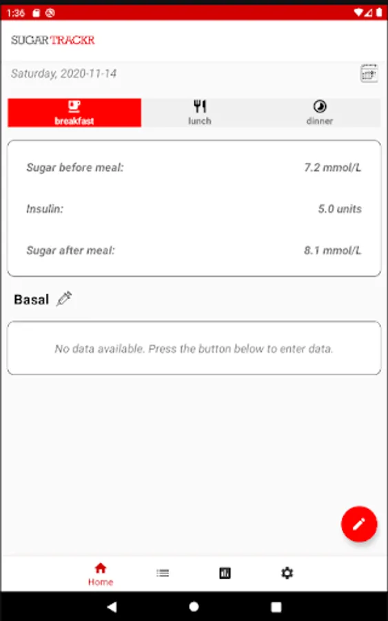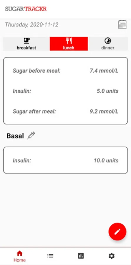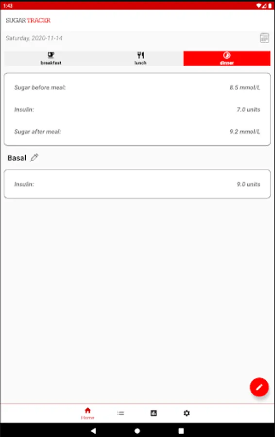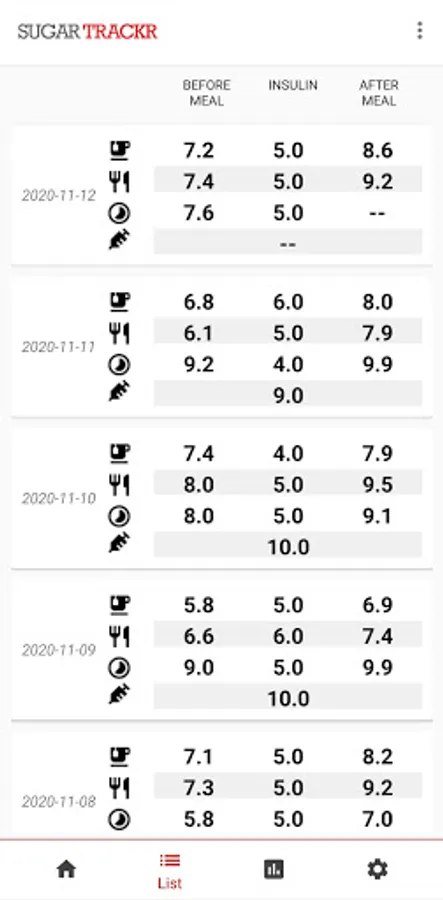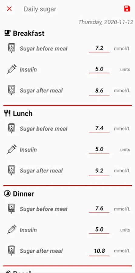 Record your insulin intake and sugar levels before and after the 3 main meals - breakfast, lunch and dinner. Also record your basal insulin before sleep.