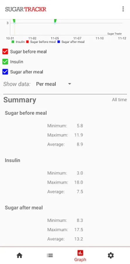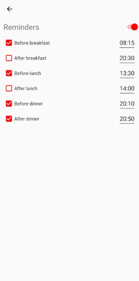 Never again forget to record any blood sugar levels or insulin intake. Set reminders before and after meals.