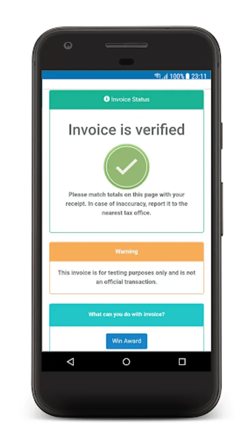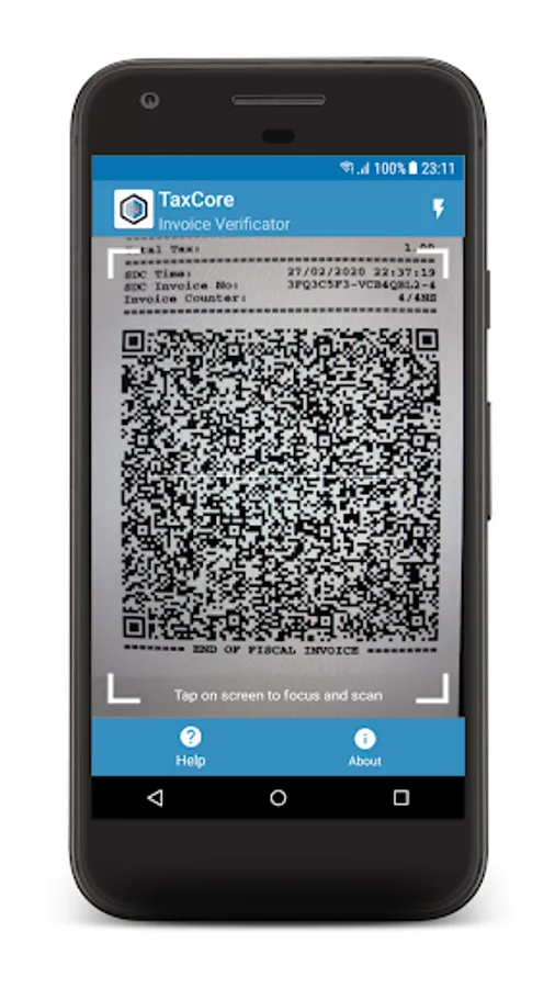 In order to use the TaxCore Invoice Verificator, make sure you are using a phone with a built-in camera. In addition, in order to verify the receipt, after scanning a QR code, make sure your device is connected to the Internet.