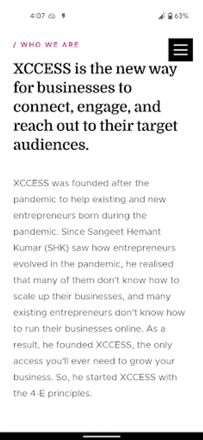 XCCESS was founded after the pandemic to help existing and new entrepreneurs born during the pandemic. Since Sangeet Hemant Kumar (SHK) saw how entrepreneurs evolved in the pandemic, he realised that many of them don't know how to scale up their businesses, and many existing entrepreneurs don't know how to run their businesses online. As a result, he founded XCCESS, the only access you'll ever need to grow your business. So, he started XCCESS with the 4-E principles.
