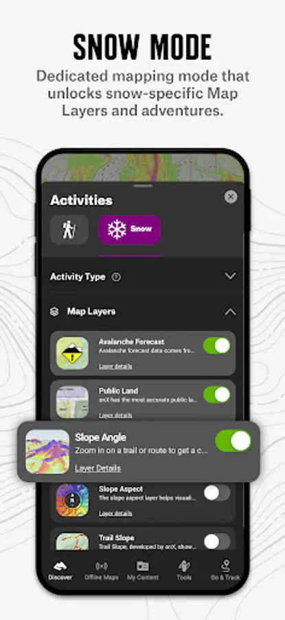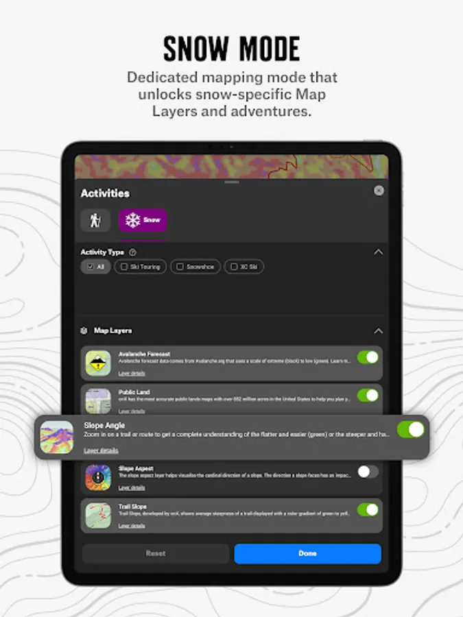 We adventure in three dimensions, your planning should reflect that. With a 3D map you can visualize terrain, scout lines, and plan for hazards before you hit the trail. See recent conditions with reports from other trail users, and get winter snow info from SNOTEL stations and regional avalanche forecasts right in the app. Build custom routes seamlessly with snap-to-trail functionality, and drop Waypoints to leave notes on key points. Use Slope Angle, Slope Aspect, Trail Slope, and Wildfire Layers to plan in more granular detail.