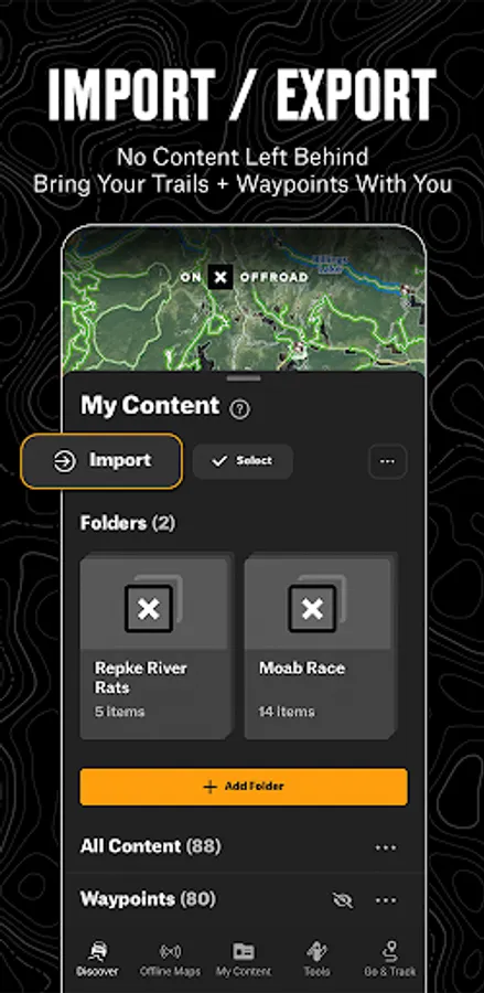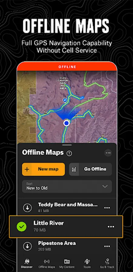Save Offline Maps to bring your custom maps and adventure along when you're outside cell coverage on the trail. With the onX Offroad App, you turn your phone into a handheld GPS device using your phone's internal GPS. Navigate offline by following the blue dot to always know how to get home–wherever home is that night.