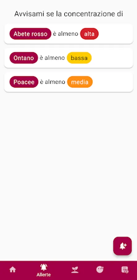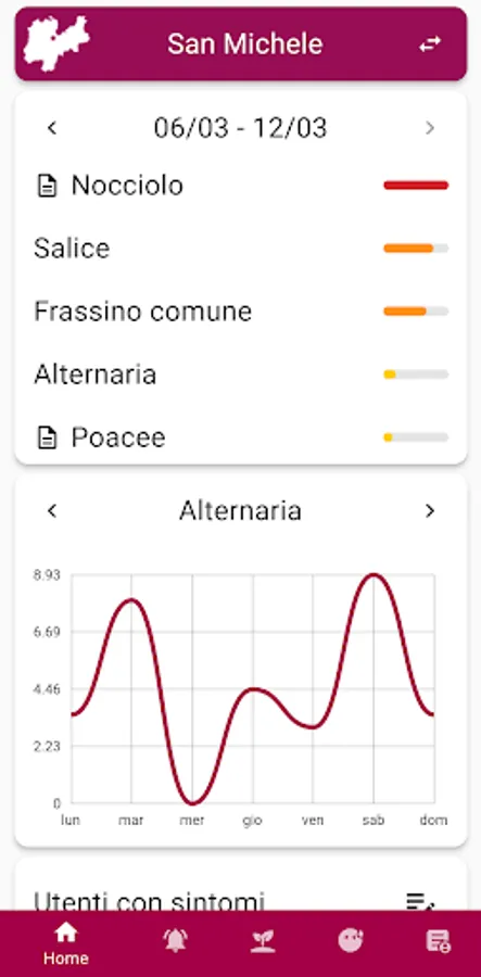 You will be able to set up notifications that alert you when there are changes in the quantity of pollen you are interested in, register your symptoms, and view the reports of other symptomatics like you in Trentino. You will be able to compare your symptoms with the presence of pollen in the atmosphere, to help you understand which ones you are most sensitive to and you will also be able to learn to recognize the plants that produce them and make your contribution by reporting their presence in the area and the phase of flowering.