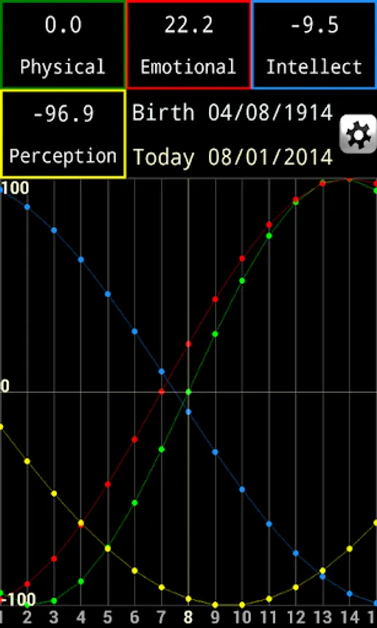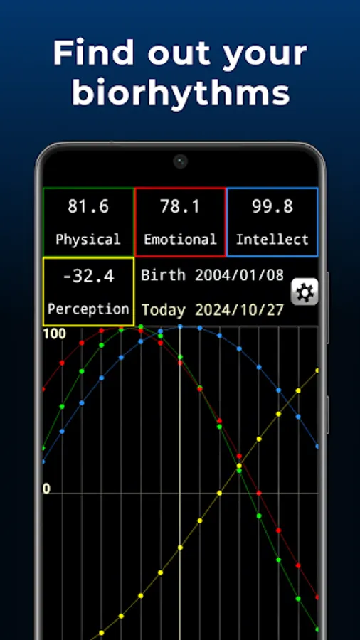 The app measures your biorhythm values on a scale from -100 (lowest) to 100 (highest), so you can see at a glance where your physical, emotional, and mental strengths or challenges lie on any given day.