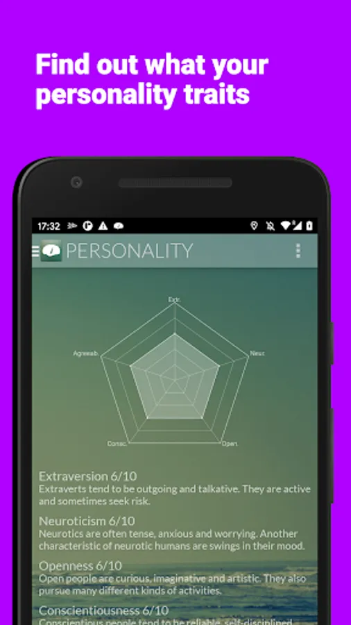 Menthal shows you how your mood develops over time with a mood diary. Psychological questionnaires scientifically measure your personality traits. Find out how extroverted, sensitive, or efficient you are. You can choose not to answer these questions or customize them in the app settings.