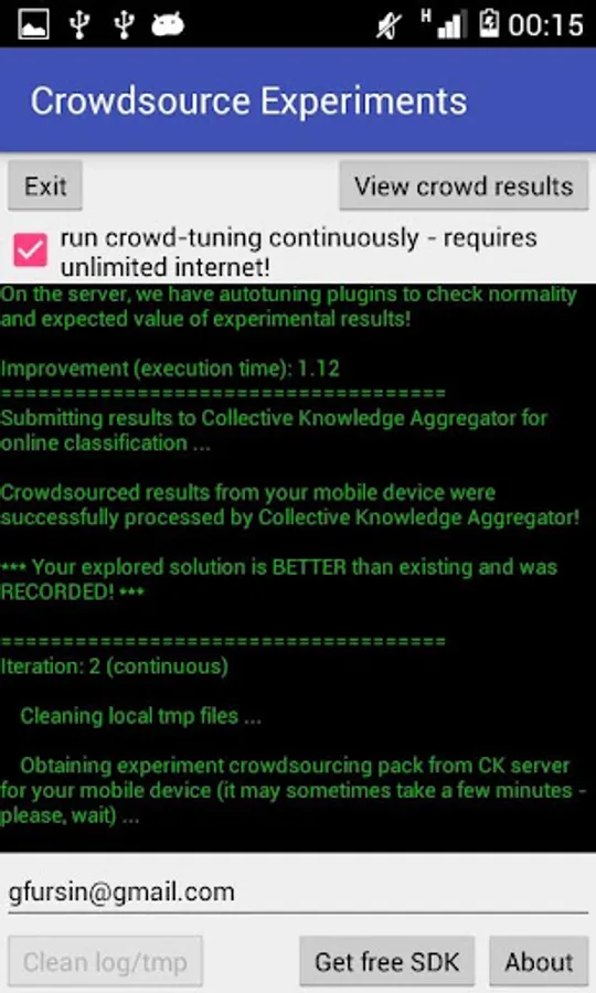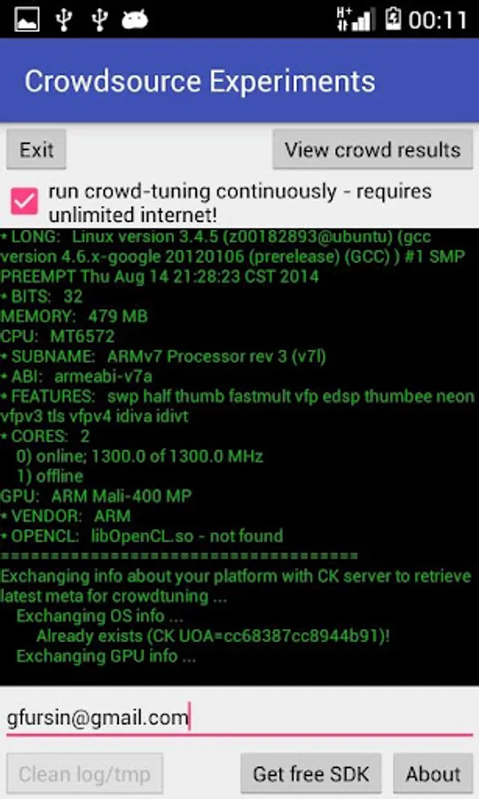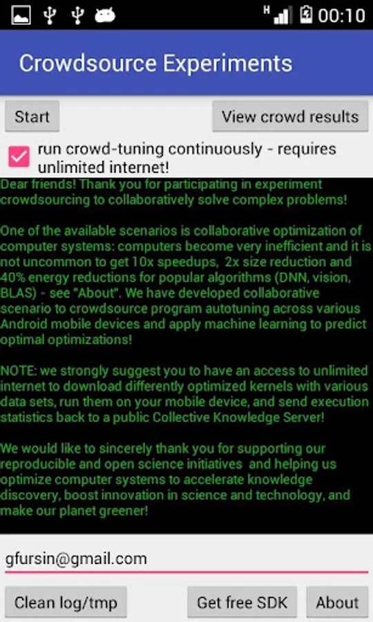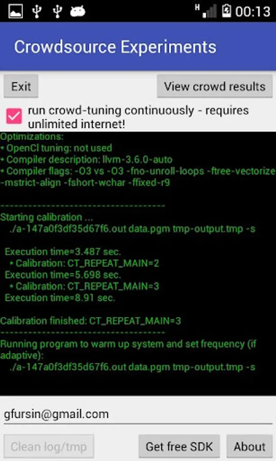 This application lets you participate in experiment crowdsourcing to help researchers solve complex problems using open-source Collective Knowledge Engine available at http://github.com/ctuning/ck . You can see all public crowd results at http://cknowledge.org/repo! You can also check out other ways to participate in experiment crowdsourcing (using laptops and data centers) at https://github.com/ctuning/ck/wiki/Crowdsourcing-optimization. Finally, you can get open sources of this Android app at https://github.com/ctuning/crowdsource-experiments-using-android-devices . This development is coordinated by the non-profit cTuning foundation: http://cTuning.org . Please, check out our other initiatives for open science at http://cTuning.org/reproducibility-wiki .