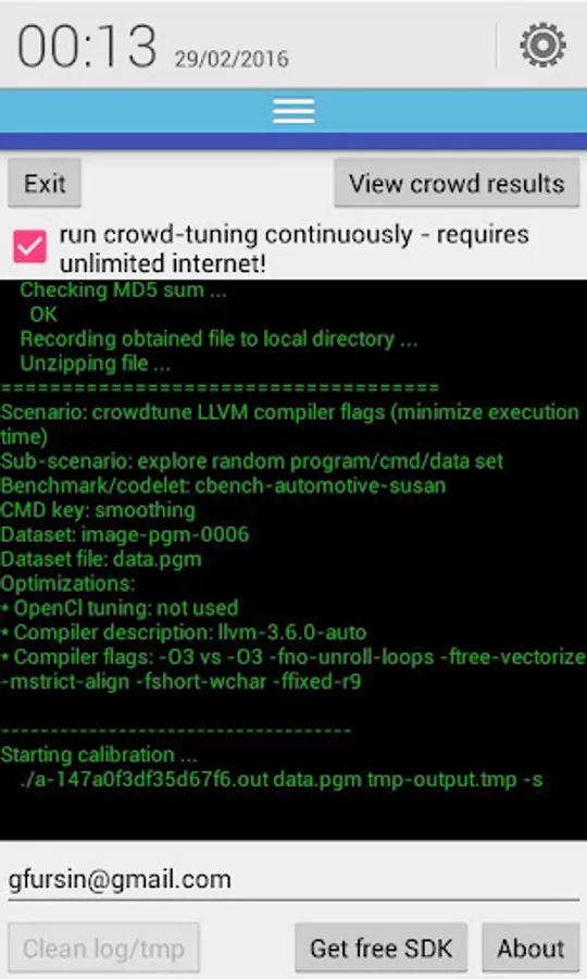 With the help of the non-profit cTuning foundation, we have developed this open source Collective Knowledge technology (CK) to let the community share workloads, data sets, tools and experimental workflows in an open CK format via GitHub or BitBucket, crowdsource experiments across numerous devices provided by volunteers, classify solutions on the fly (active learning), apply predictive analytics, exchange knowledge and reproduce results. Our current shared experimental scenarios including GCC and LLVM compiler flag tuning, and we plan to add automatic OpenCL/CUDA tuning, scalability testing, compiler bug detection and numerical stability analysis (see CK-based interactive report: http://cknowledge.org/interactive-report )! This application simply queries any available public CK server, obtains experimental pack for your device (such as several binaries of a shared benchmark with different optimizations), runs it on your mobile device with some random data set and send statistics back to CK server to be processed using active learning and predictive analytics.