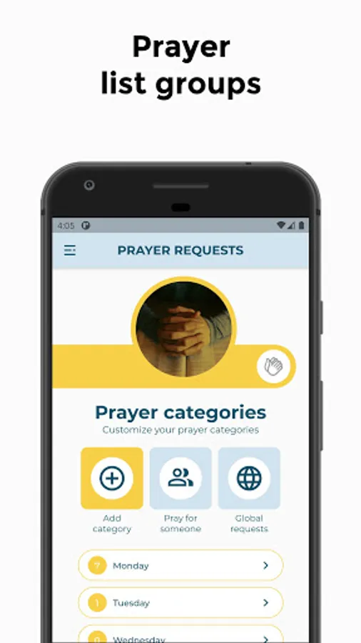 Use the integrated prayer management system to log prayer requests, manage their recurrence, share them with friends and receive notifications when they're prayed for.