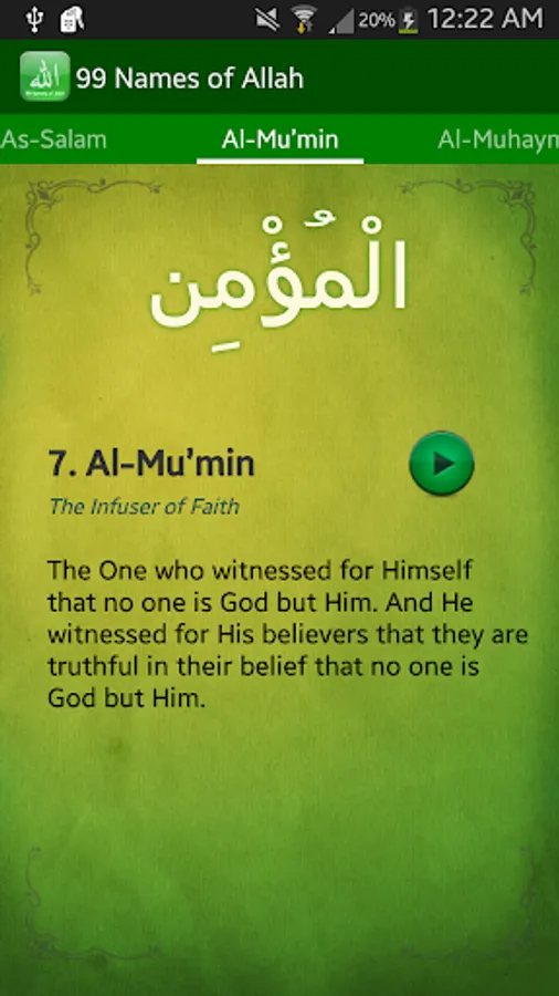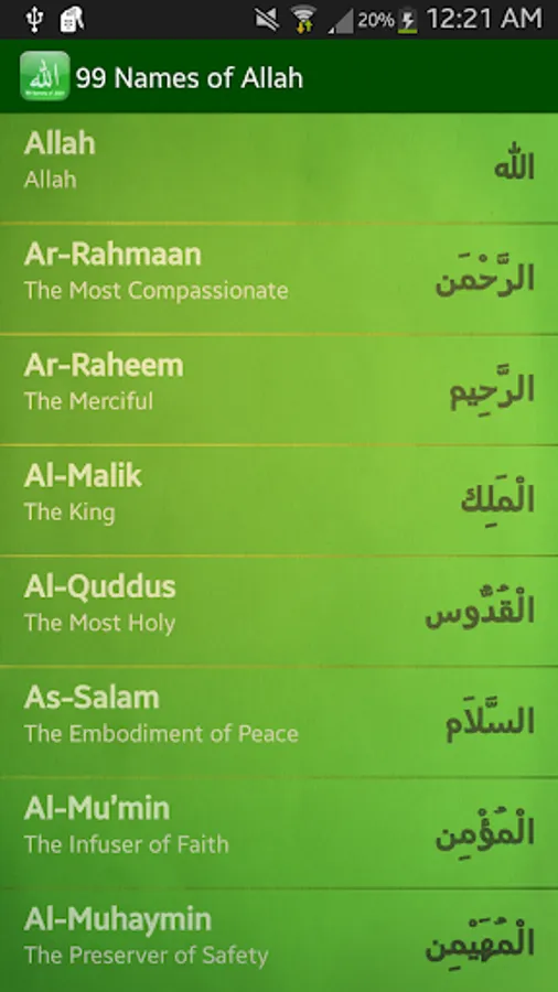 This free application contains the 99 Names of Allah or the Asma-ul-Husna. You can listen, read and memorize the 99 Names of Allah. The application is 100% FREE and there are no ads to disturb you.