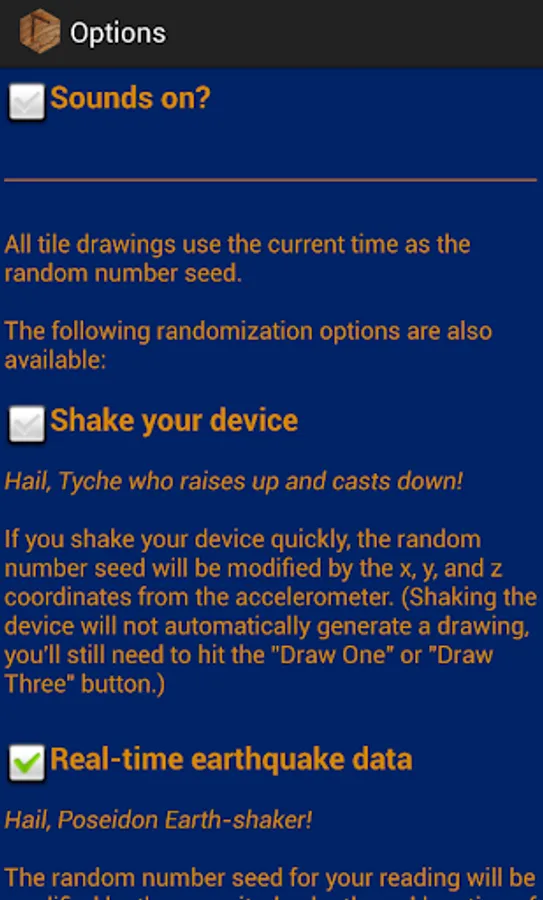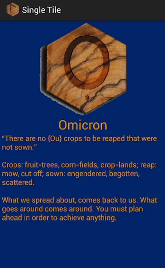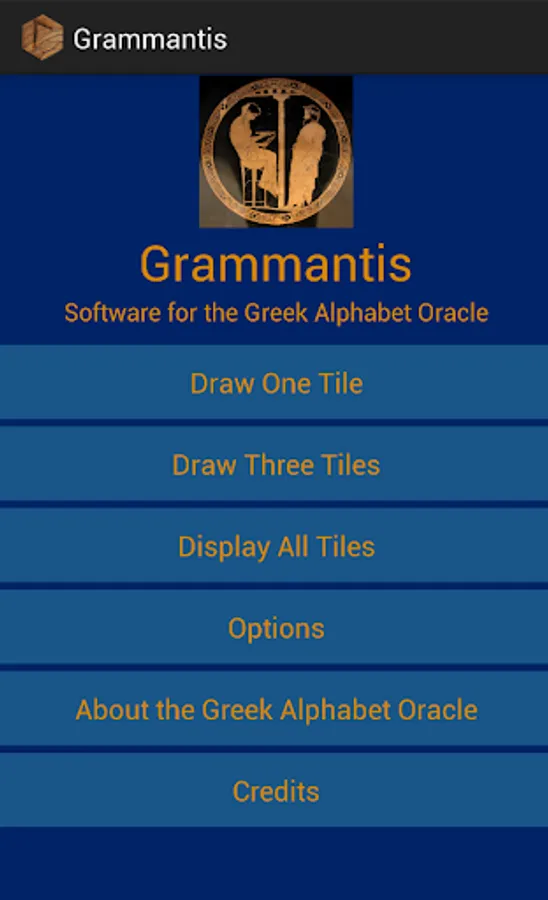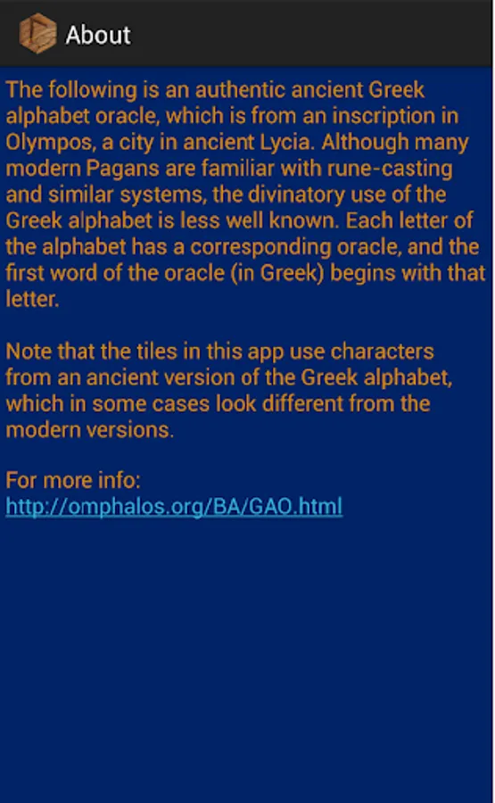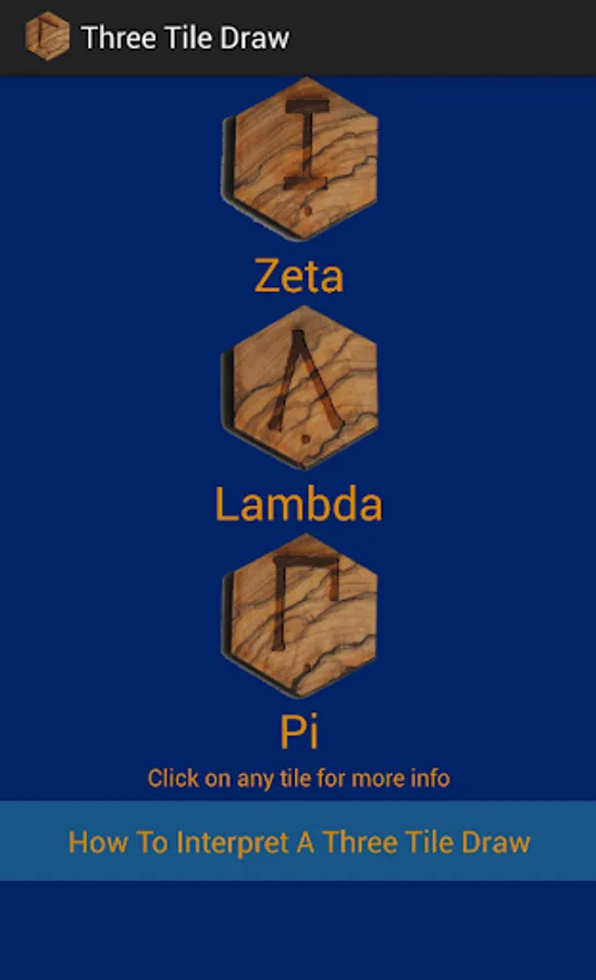From a translation by John Opsopaus, this app shows the divinatory meanings of Greek letters based on an ancient inscription found in the city of Olympos. Options include a one tile draw, a three tile draw, and a listing of all letters for study.