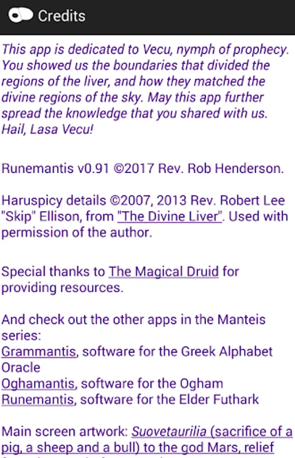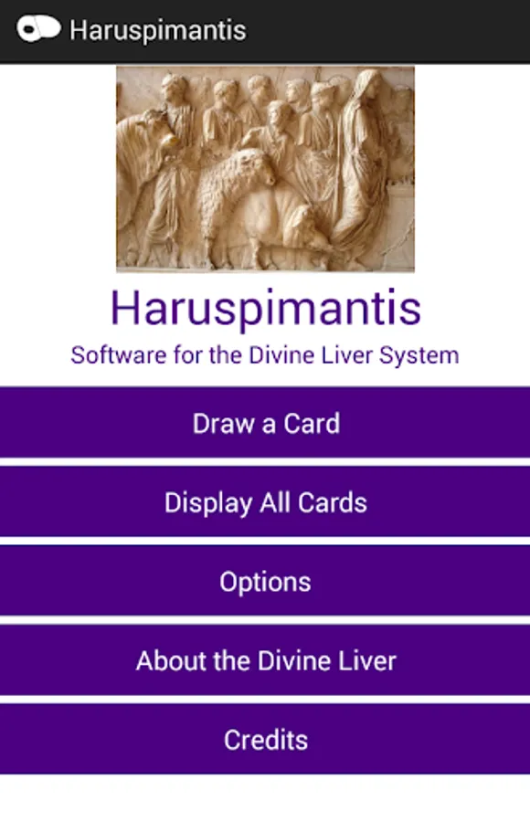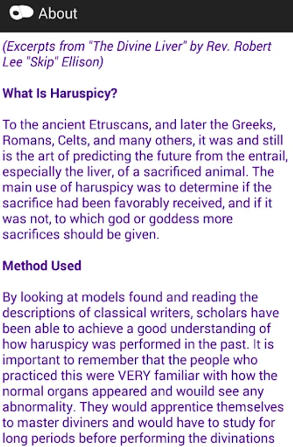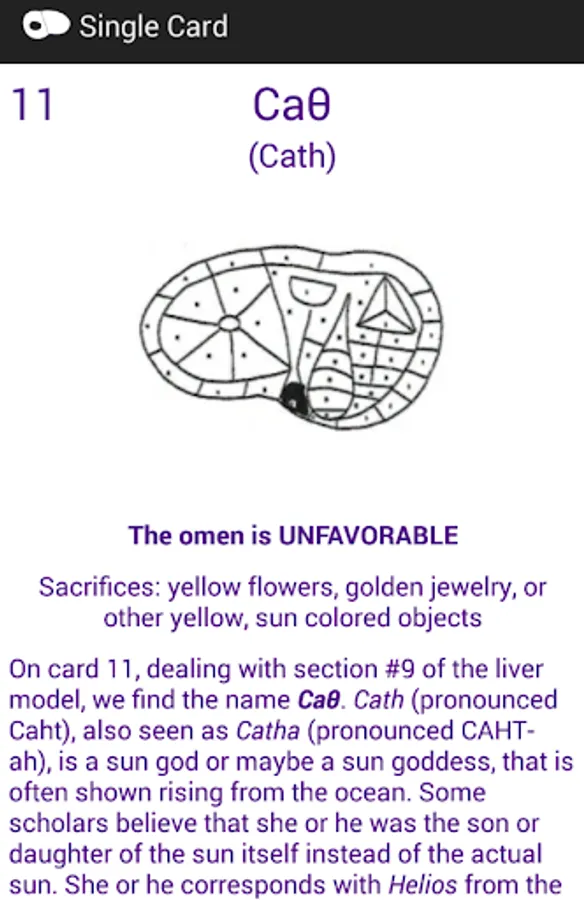 Based on "The Divine Liver" by Rev. Robert Lee "Skip" Ellison, this app will let you study this card-based divination system based on the ancient Etruscan practice of haruspicy. Options include a one tile draw and a listing of all letters for study.