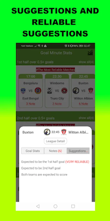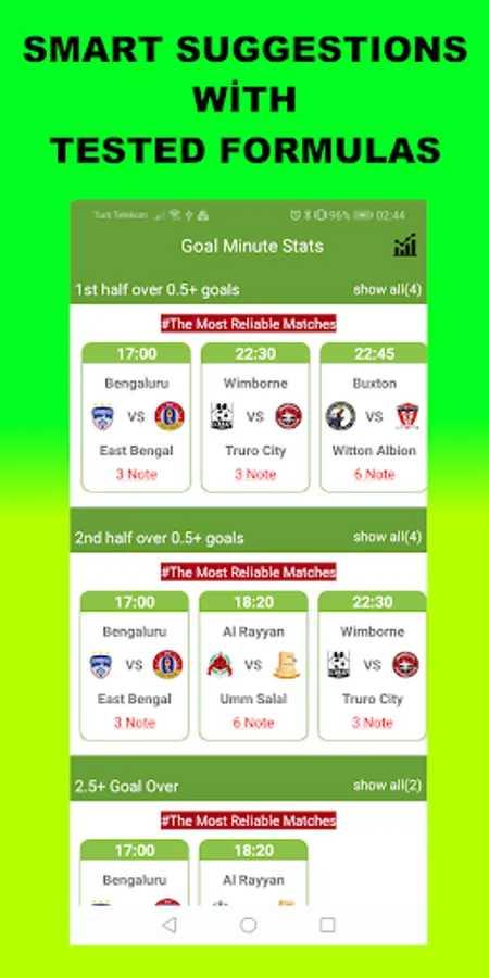 According to artificial intelligence and tested formulas, you can find the most reliable match predictions of the day and remarkable tips about teams in this application in an easy, practical and simple way. According to the goal data of the football teams, the suggestion engine will present you many remarkable, interesting and critical information and offer suggestions about the matches. In this application, which contains statistics of more than 100 countries and more than 3000 teams, you will notice very interesting and surprising information.