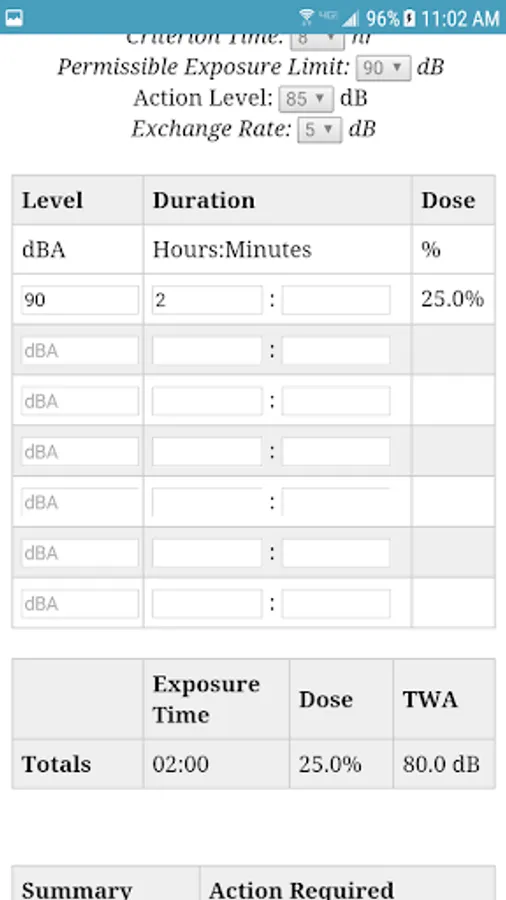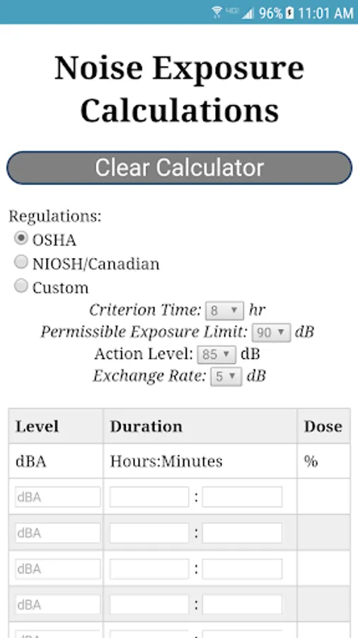 This virtual calculator can be used to calculate time weighted exposure to noise. The calculator allows the user to input multiple noise measurements, each with a duration and noise magnitude, Time weighted average exposure is calculated following multiple methods include OSHA and NIOSH. The calculator also provides some guidance on corrective action steps which might be considered to reduce a workers noise exposure.