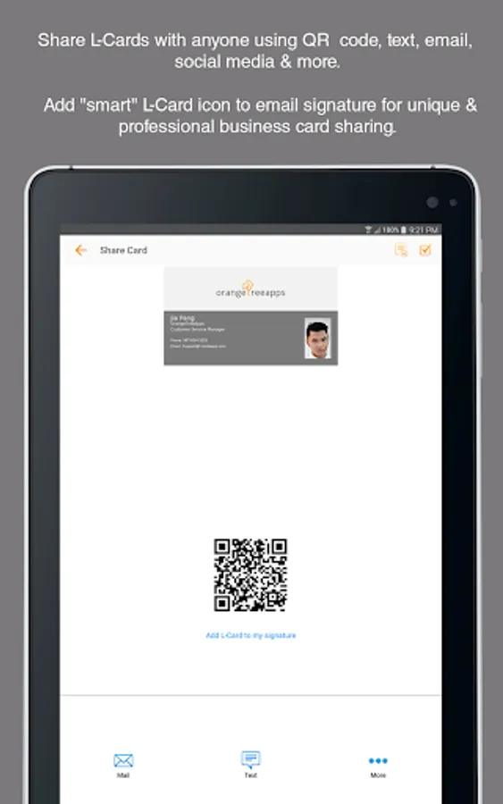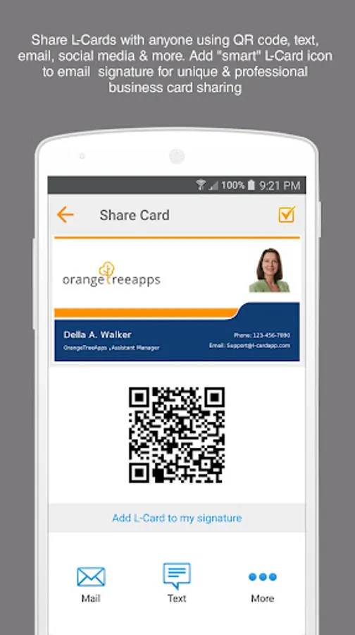 * Use the L-Card QR code scanner, Text, Email or social media to share and receive cards.