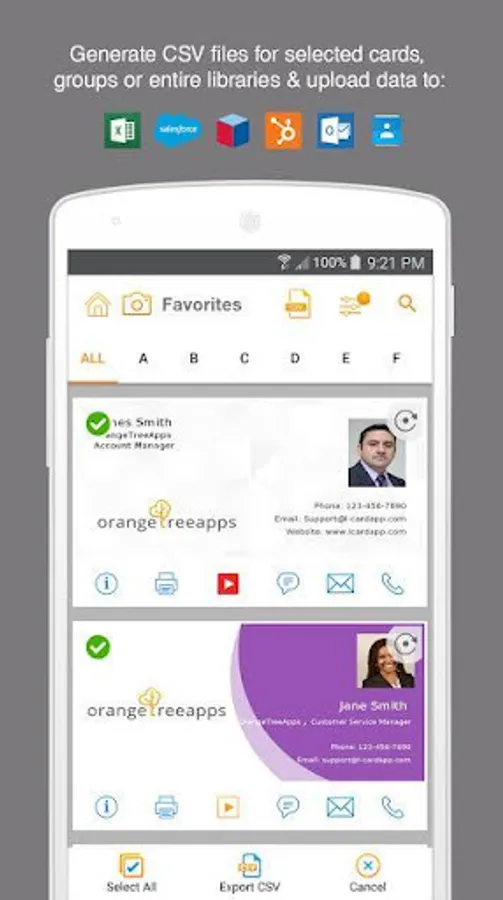 * Directly Export cards to Salesforce, Google Contacts and Outlook. Create CSV files and upload data into your favorite CRM.