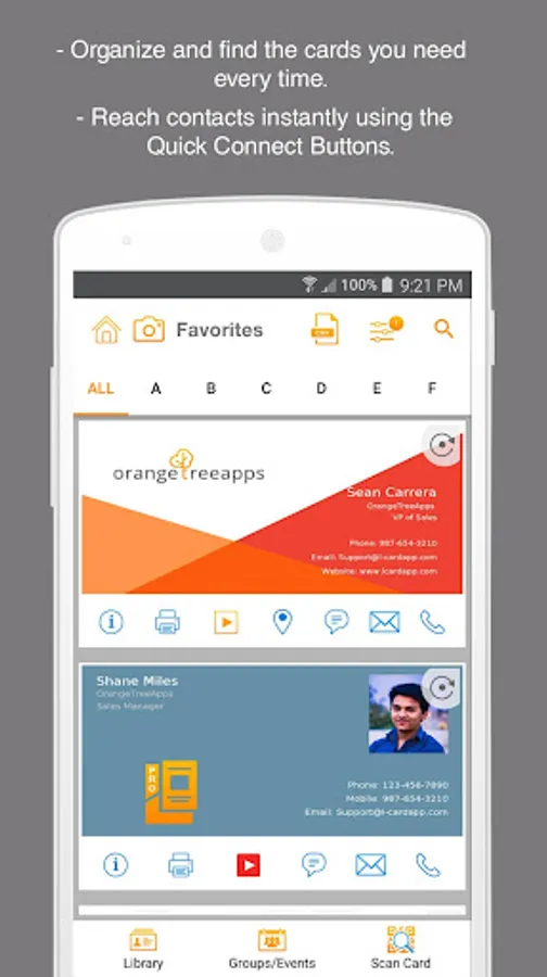 * Call, Text, or Email your contacts directly from a selected card using the Quick Connect Buttons.