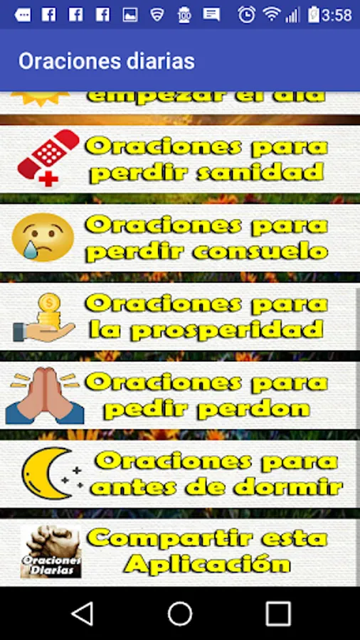 Daily prayers is an application made to have spiritual messages for each occasion, in which we have prayers for the family, thanksgiving, to start the day, for healing, comfort, prosperity, asking for forgiveness, and before bedtime, special messages that They help us get closer to God