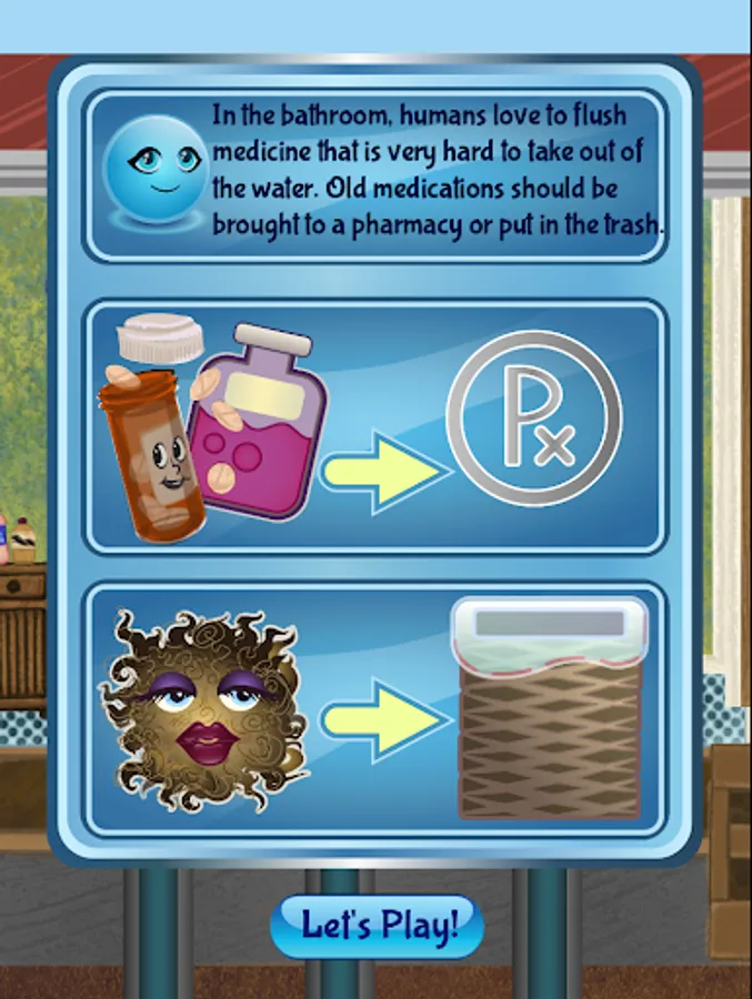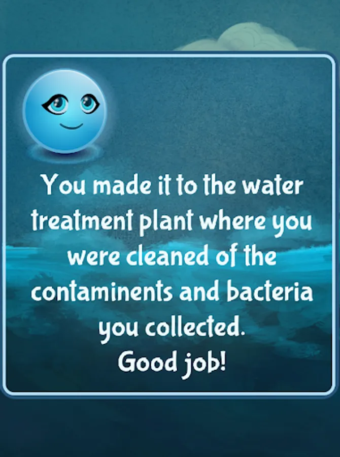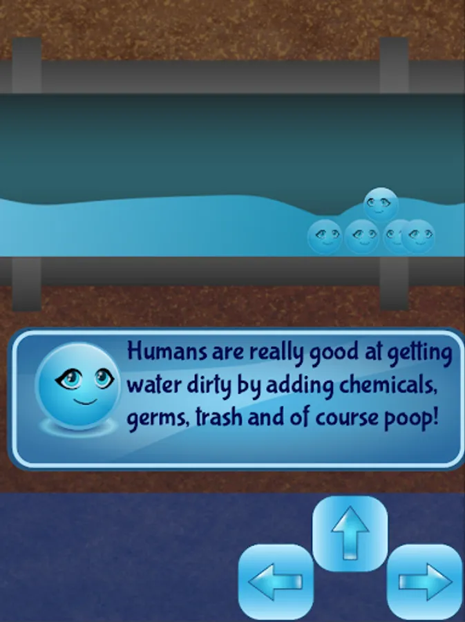 We are all part of the water cycle! Every day we use water and end up making it really dirty. However, most people don’t really think about what happens to all that water when it gets flushed down a toilet, goes down a sink, or flows into a storm drain on our streets. In this fun and educational game, you will become a water drop that falls down into underground pipes. You will come across challenges on your way to your ultimate goal – get to the wastewater treatment plant where you are cleaned! You must answer questions, avoid leaks and battle enemies such as hair balls, grease blobs, dog poop and pollution. You will learn about what humans put into our water and what each of us can do to protect our water system. You also get to collect points along the way and use them to dress up your water drop in fun new hats at the shop! So get out there are start keeping our water clean!