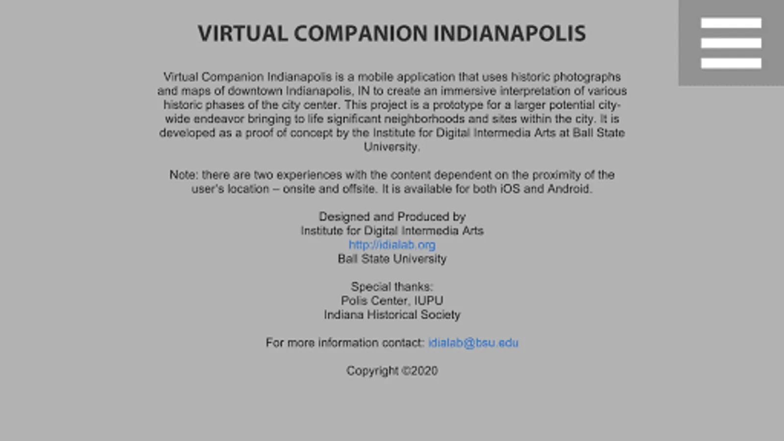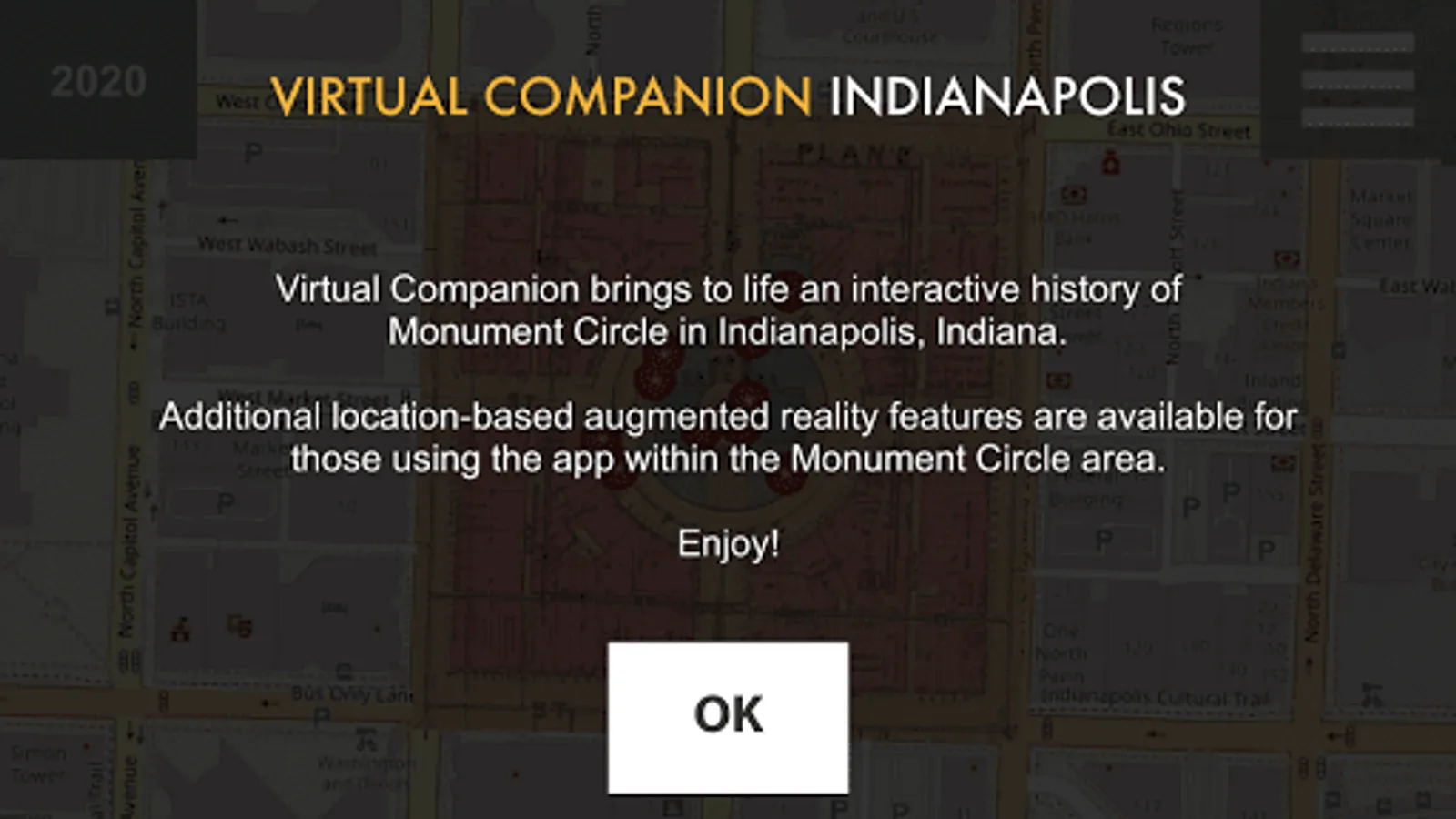 Virtual Companion: Indianapolis is a mobile application that uses historic photographs and maps of downtown Indianapolis, IN to create an immersive interpretation of various historic phases of the city center. This project is a prototype for a larger potential city-wide endeavor bringing to life significant neighborhoods and sites within the city. It is developed as a possible collaboration between the Institute for Digital Intermedia Arts at Ball State University, the Polis Center at Indiana University Purdue University Indianapolis and the Indiana Historical Society.