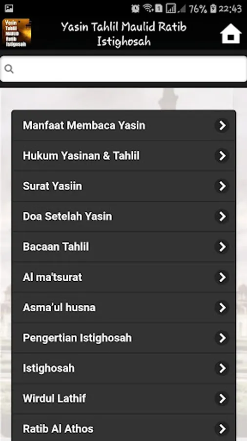Yasin Tahlil Maulid Ratib Istighosah and Juz Amma are usually practiced by the santri. and also practiced by many elders. This application is very simple and lightweight containing a collection of tawasul readings, procedures, and bertawasul laws.