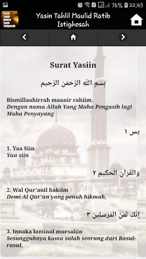 This application contains Yasin Tahlil Maulid Ratib Istighosah and Juz Amma collected from various sources in accordance with the guidance of the scholars. The reading of Yasin Tahlilan is completed with Arabic and Latin writing.