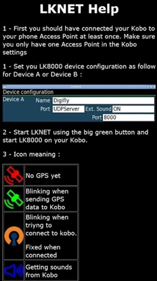 This application provides raw NMEA data to LK8000 Tactical Flight Computer via UDP connection. If your phone has a pressure sensor also pressure altitude is sent using the Digifly driver.