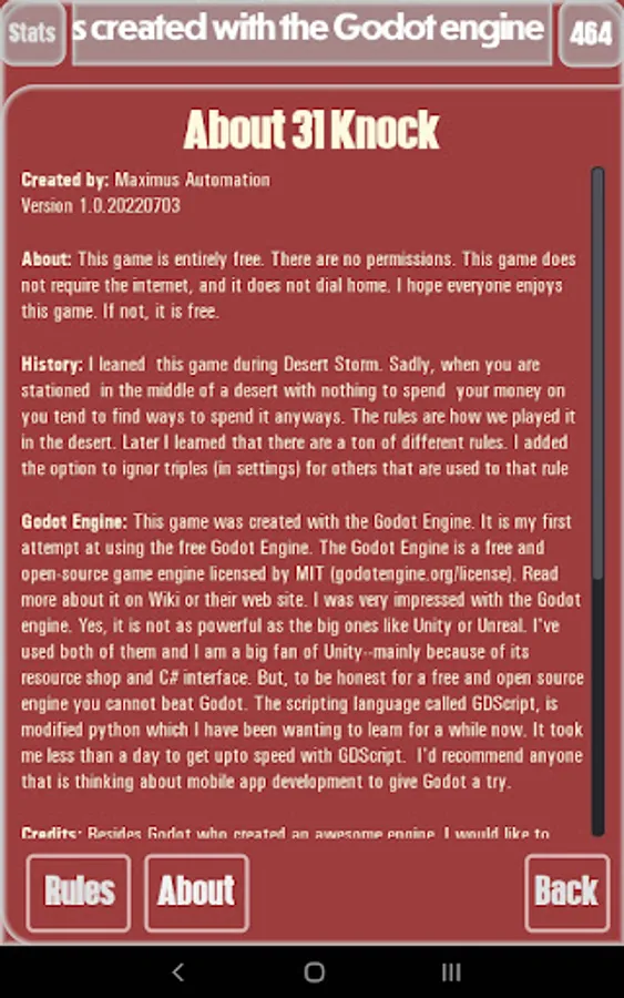 Godot Engine: This game was created with the Godot Engine. It is my first attempt at using the Godot Engine. The Godot Engine is a free and open-source game engine licensed by MIT (godotengine.org/license). Read more about it on Wiki or their web site.