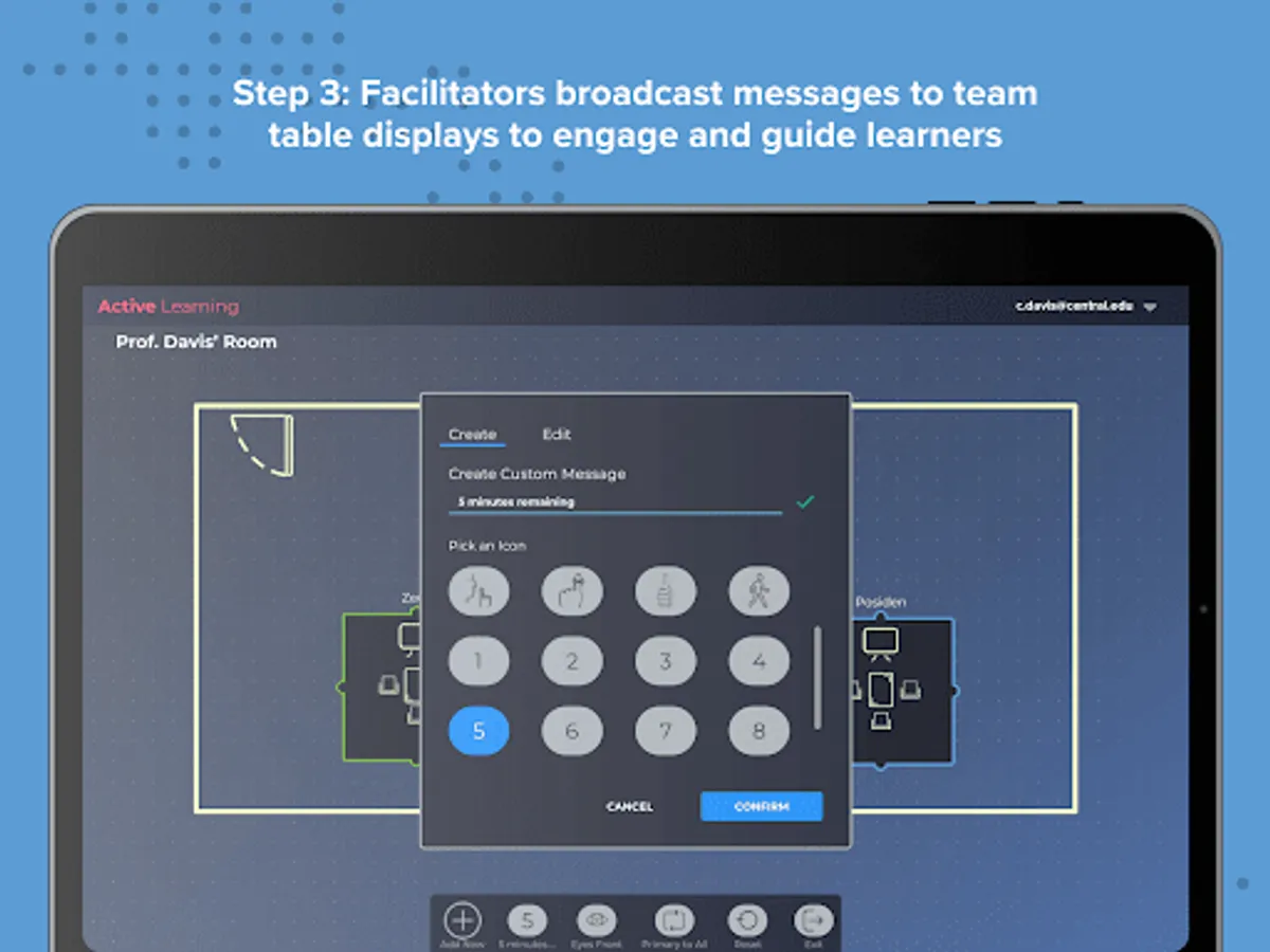 The Solstice Active Learning app features a drag-and-drop interface to allow admins and facilitators to virtually map the multi-screen environment and then easily route video and broadcast messages to team displays in real-time.
