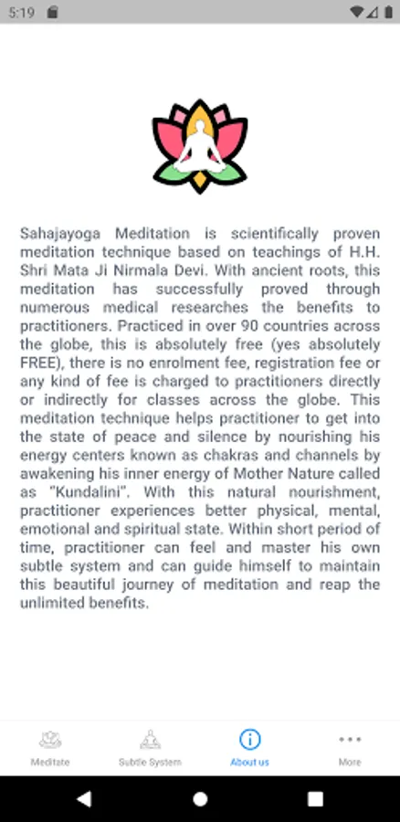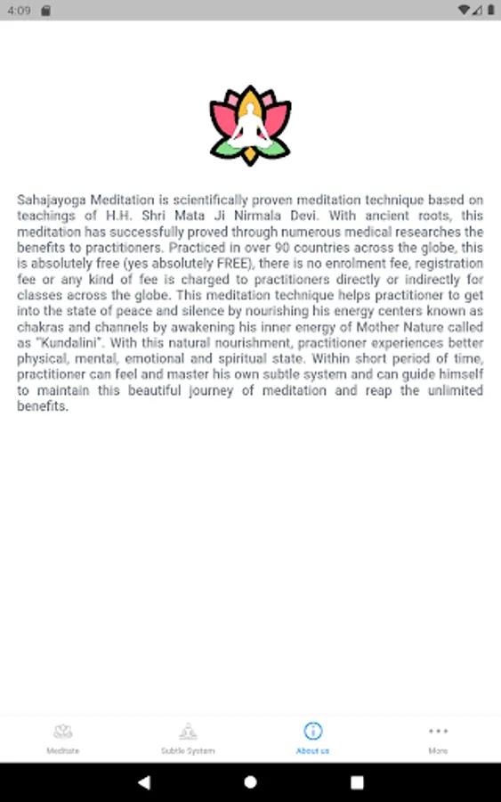 Based on the teachings of H.H. Shri Mataji Nirmala Devi known as Sahajayoga Meditation. With multiple medical research conducted across the globe, Sahajayoga Meditation is scientifically proven and probably the only meditation around the world with numerous proven benefits.