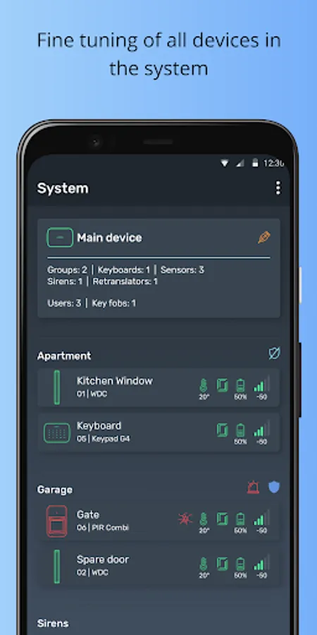 From your mobile phone you will be able to fully adjust the security system: install, test and calibrate wireless elements of the system; manage security groups; connect security panels to monitoring companies; add and remove users and give them the rights to control your security system with U-Prox Home app.